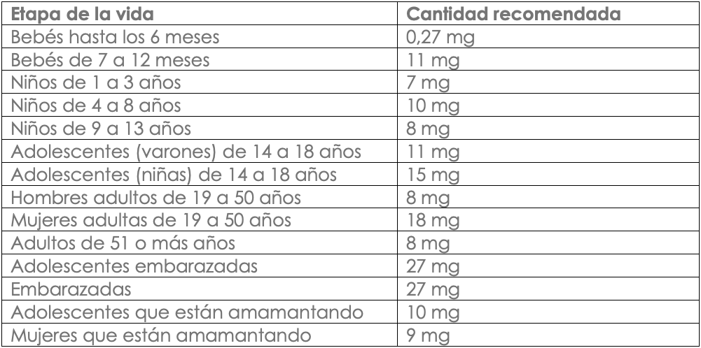 A continuación, se detallan los valores de referencia en miligramos (mg) para distintos grupos según su etapa de vida¹: